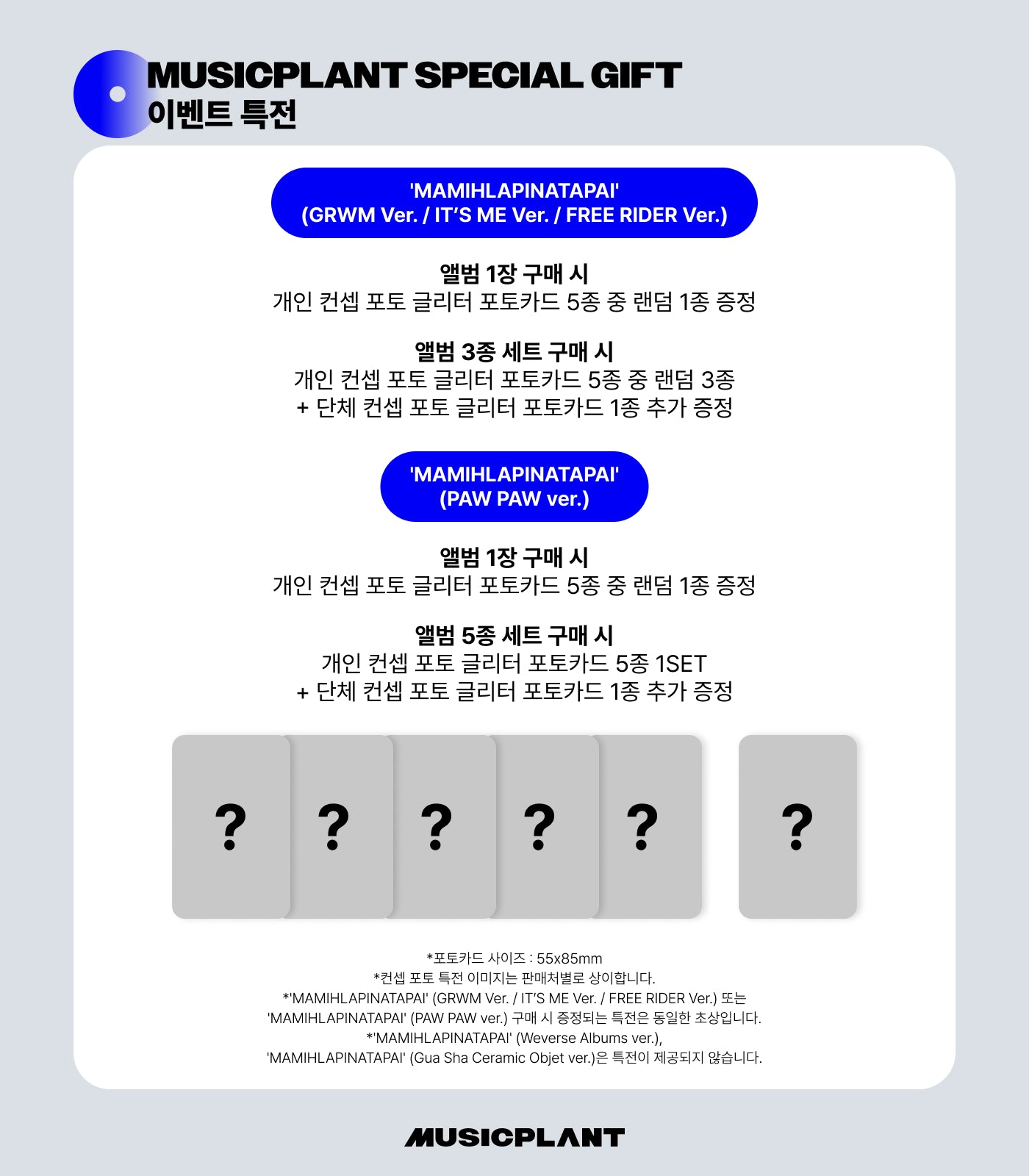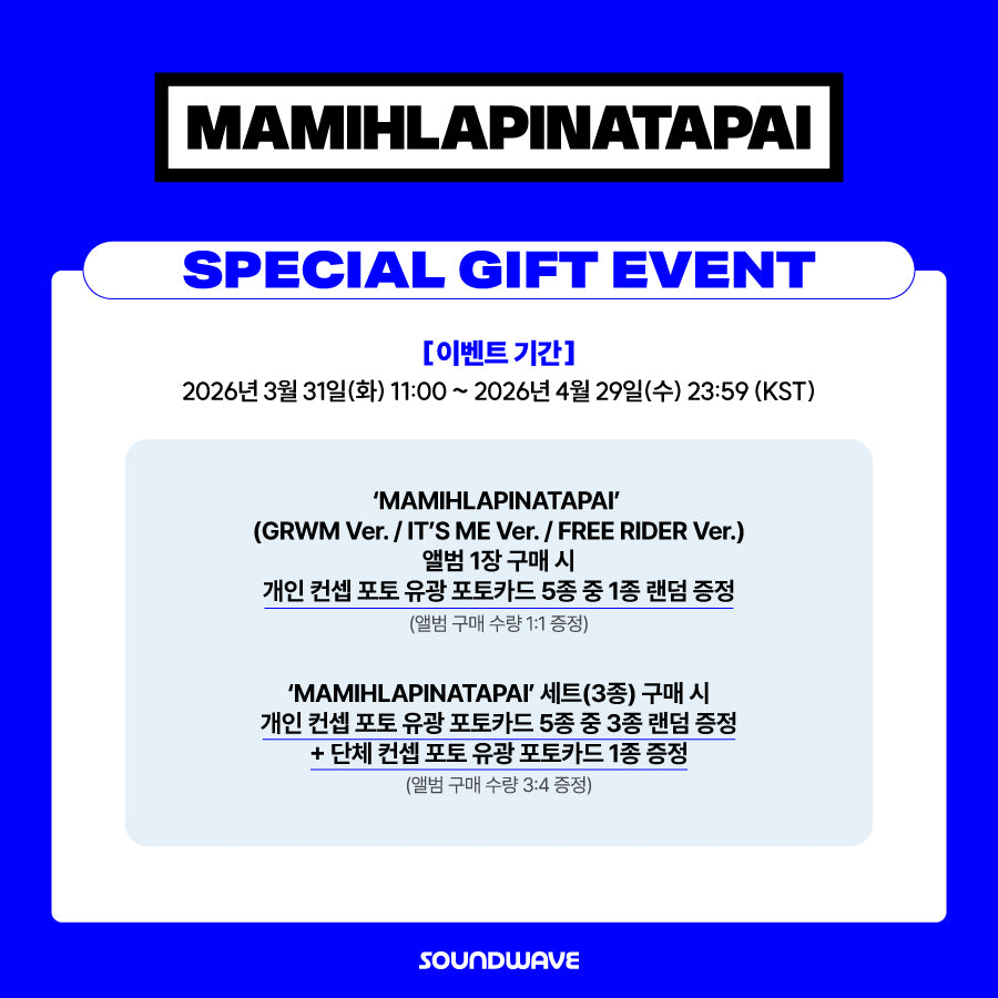 Photobook Pre-order Benefit SoundwaveIndividual: Random 1 personal concept glossy photocardSet: Random 3 personal concept glossy photocards + 1 group concept...